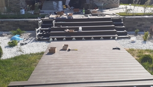Установка основания в т.ч. с регулируемыми опорами, укладка лаг, монтаж террасной доски и уголков обрамления.